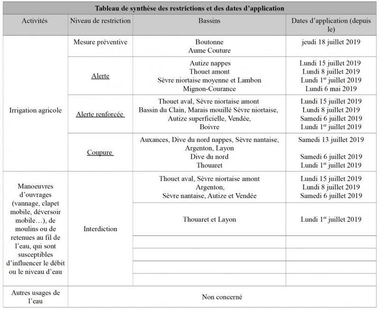 Le tableau ci-joint actualise l'ensemble des mesures en vigueur dans le département des Deux-Sèvres. Elles seront adaptées sur les bassins deux-sévriens, au vu de l'évolution de la situation. Les organismes uniques de gestion collective (OUGC) sont à la disposition des irrigants pour toute précision utile concernant ces mesures.