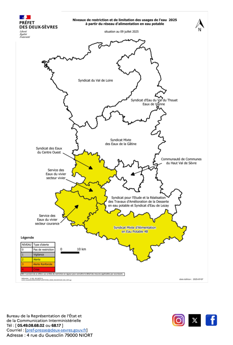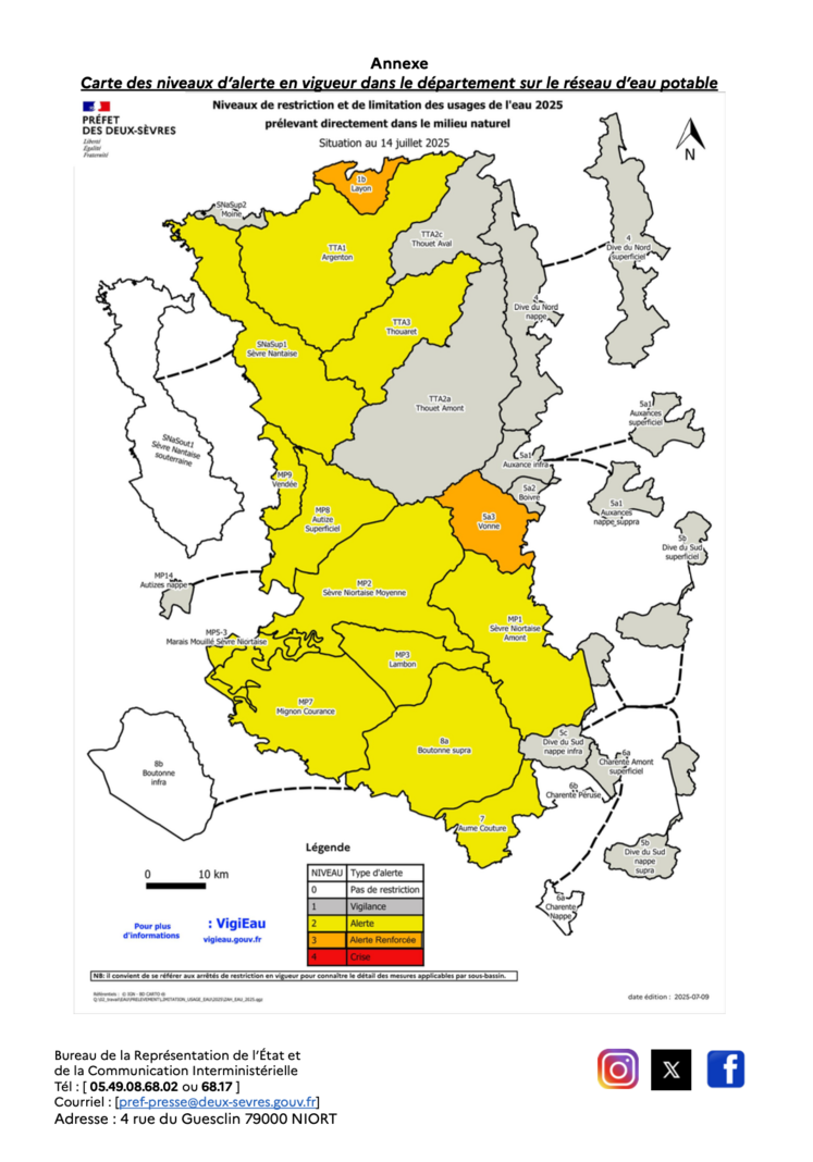 • Passage en niveau de vigilance sur le sous-bassin Charente amont superficielle. Elles complètent ou renforcent les mesures fixées par les précédents arrêtés.
