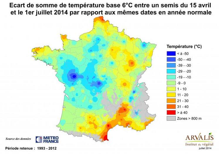 La date de floraison dépend de la précocité des hybrides, de la date de semis et du scénario climatique de l’année. La carte ci-contre illustre l’état d’avancement de la culture en comparant le cumul de températures 2014 à la normale de ces vingt dernières années, pour un semis du 15 avril et jusqu’au 1er juillet.Les régions en jaune et orange présentent une avance du cumul de températures de 10 à 30 degrés jours par rapport à la normale, ce qui correspond à environ un point de MS à la récolte. Les régions en bleu présentent un retard du même ordre. Ces écarts ne sont pas significatifs et évolueront en fonction du scénario climatique des prochaines semaines.Pour le moment, on note une semaine d’avance par rapport à 2013.Cette carte est construite pour un semis du 15 avril et ne prend pas en compte des scénarios hydriques exceptionnels (excès ou déficit de pluviométrie) qui ont pu perturber le développement des plantes. Par rapport à 2013, le cumul de températures 2014 est supérieur en toutes régions, d’au moins 70 à 100 degrés jours, l’équivalent d’au moins une semaine d’avance à la floraison.Au niveau de la parcelle, et pour prendre en compte la date de semis, le premier indicateur de la précocité de la culture reste la date de floraison femelle, c'est-à-dire la sortie des soies.Pour déterminer la date de floraison, il faut visiter régulièrement les parcelles au moment de l’apparition des soies. Éviter les bordures de parcelle. La parcelle est fleurie quand 50 % des plantes présentent des soies. Noter alors la date de floraison.Puis, avec les données météo statistiques, il est possible de faire une première prévision de la période probable de récolte. En effet, les besoins en températures de la plante sont d’environ 600 à 650 degrés jours pour atteindre 32 % MS. Pour affiner la prévision et prendre en compte la climatologie de l’année, il faudra revisiter la parcelle un mois après la floraison et observer le remplissage des grains.