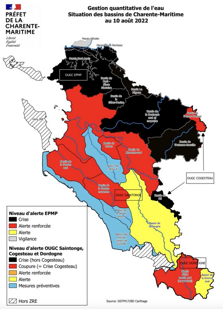 Compte tenu de l’état de la ressource en eau, le préfet de la Charente-Maritime prend les mesures de limitation des usages de l’eau suivantes :