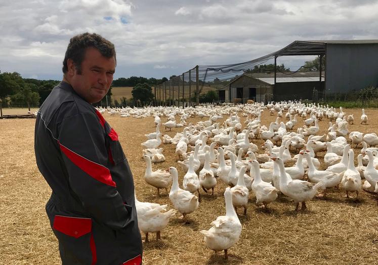 Quand Samuel Belleannée commence à parler de ses oies, il devient aussi bavard qu’elles ! Ses « fifilles », il les élève chaque année avec passion depuis 2011 à Saint-Maurice-Étusson. Associé du Gaec Villeneuve, il a voulu diversifier la production jusque-là spécialisée en bovin viande. L’exploitation, qui compte aujourd’hui 550 ha de SAU, voit naître 320 Blondes d’Aquitaine chaque année et engraisse aussi 420 broutards par an.