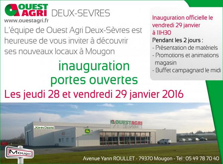 Ouest Agri Deux-Sèvres inaugure ses nouveaux locaux à Mougon. Inauguration officielle le vendredi 29 à 11h30, avenue Yann Roullet. Pendant deux jours, présentation de matériels, buffet le midi. Tél. 05 49 78 70 40.
