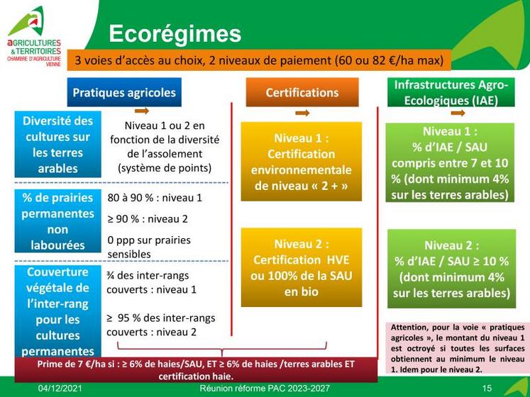 Même si c’est au printemps 2023 qu’il faudra faire sa déclaration pour obtenir les aides Pac dans sa nouvelle mouture, mieux vaut se renseigner dès à présent sur les évolutions prévues. Car pour obtenir les éco-régimes, il faudra entrer dans de nouveaux critères, qu’il faudra évidemment avoir mis en place dans son exploitation dès 2022. De leur côté, les agriculteurs bio s'inquiète de la suppression prévue, dans le plan stratégique national de la Pac, de l’aide au maintien en AB pour les producteurs déjà convertis.