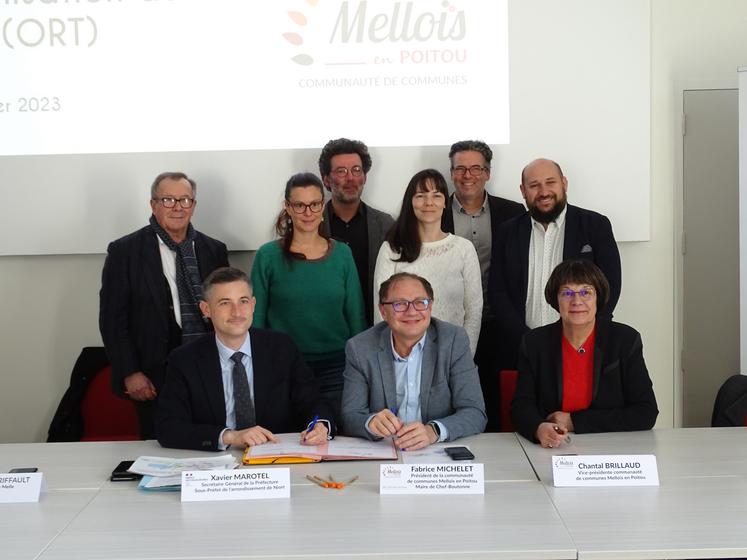 «C’est un jour à marquer d’une pierre blanche », se félicite Fabrice Michelet, le président de la Communauté de communes de Mellois en Poitou. Dans le cadre du programme national des Petites villes de demain, cinq communes du Mellois (*) ont signé, le 8 février, la convention d’opération de revitalisation des territoires (ORT), qui fait entrer le projet dans sa phase opérationnelle. Ce programme vise à accompagner les communes de moins de 20 000 habitants dans leur démarche de revitalisation du centre bourg. « Être Petite ville de demain, ce n’est pas une médaille, c’est le signe d’une fragilité, indique Nicolas Ragot, le maire de Sauzé-Vaussais. Mais la démarche que nous menons doit nous permettre d’inverser la tendance, alors que notre courbe démographique est décroissante ».