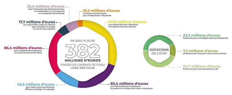 Ceci permet à l'agence de l'eau de clôturer avec plus de 436 M€ d'aides sur l'année 2023, dont 382,50 M€ distribués comme suit :