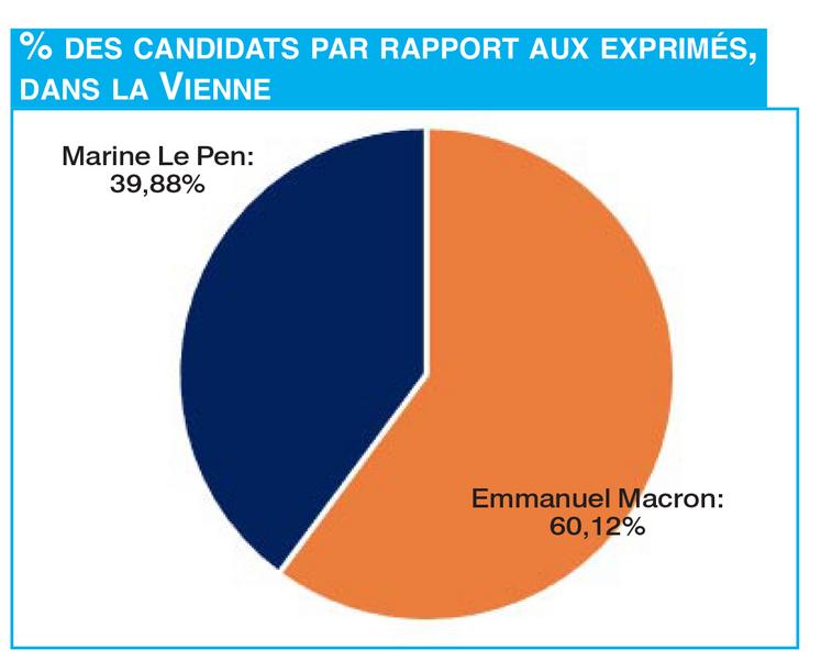 Sur les 266 communes que compte le département de la Vienne, un peu plus de la moitié ont placé Emmanuel Macron en tête, contre une grosse centaine pour Marine Le Pen. Une courte avance pour le président sortant qui s’impose tout de même largement dans le département, puisque les électeurs des grandes communes l’ont largement plébiscité. À Poitiers, il recueille ainsi 75,16% des voix, à Buxerolles 73,11%, ou à Châtellerault 60,60%. Au final, le score du président sortant sur l’ensemble de la Vienne est de 60,12%, soit 1,58% de plus qu’au national. Si plusieurs communes affichent une égalité parfaite de votes pour Emmanuel Macron et Marine le Pen (Genouillé, Leigné-les-Bois, Saint-Léomer et Saint-Romain), d’autres affichent des chiffres records pour l’un ou l’autre des candidats. Marine Le Pen recueille ainsi 70,18% des voix à Saint-Clair. À l’inverse, Emmanuel Macron dépasse les 70% des votes à Croutelle (71,07%), Fontaine le Comte (72,41%) et Mignaloux-Beauvoir (76,09%).