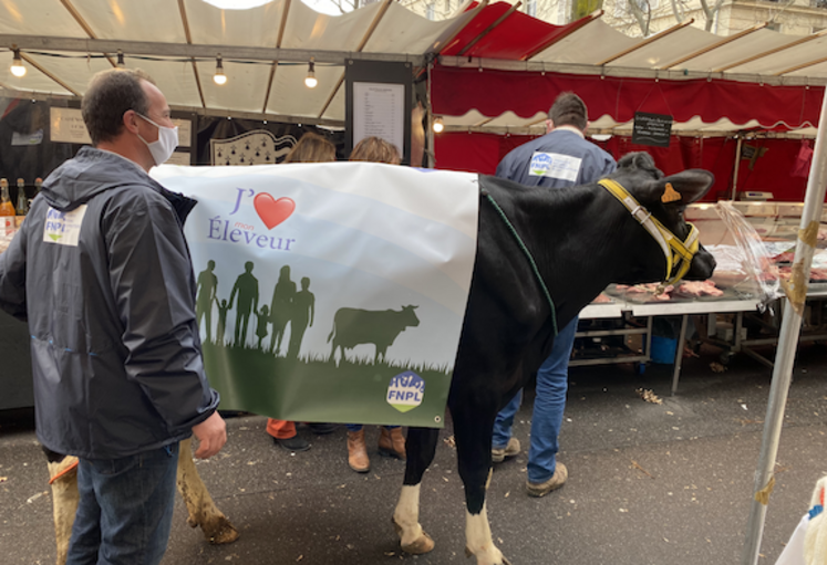 La FNPL (producteurs de lait, FNSEA), accompagnée d’une vache, était ce 3 février sur un marché du 16ème arrondissement de Paris, entre les Champs-Elysées et la tour Eiffel pour «demander aux consommateurs s'ils sont prêts à payer des produits laitiers un peu plus cher, en lien avec la loi Egalim, pour que le producteur soit rémunéré au prix de revient du lait».