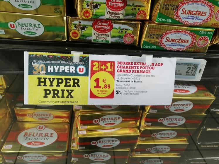Les producteurs laitiers ont été stupéfaits de découvrir, lors d’une visite au Leclerc Mendès France de Niort, une promotion sur le beurre AOP Grand fermage.