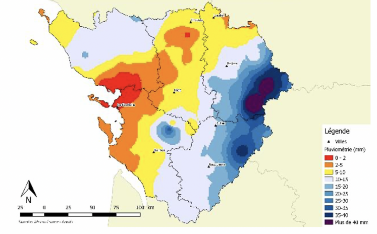 Les derniers épisodes pluvieux de la semaine dernière n’ont pas été aussi abondants qu’espérés. Le plus souvent, ils n’ont guère dépassé les 5-10 mm (voir carte ci-dessus). Sur l’Est de la région, ils ont parfois atteint 30 à 40 mm mais survenus sous forme d’averses orageuses, leur intensité s’est traduite par du ruissellement et a limité leur efficacité.