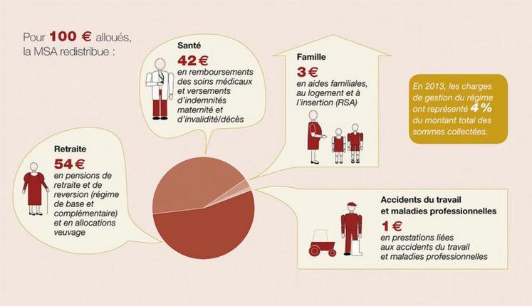 La MSA mène également des actions de prévention et d'éducation à la santé et à la sécurité au travail et agit par un ensemble d'actions et d'aides sociales. Les cotisations servent aussi à financer la retraite complémentaire et différents fonds nationaux (*).