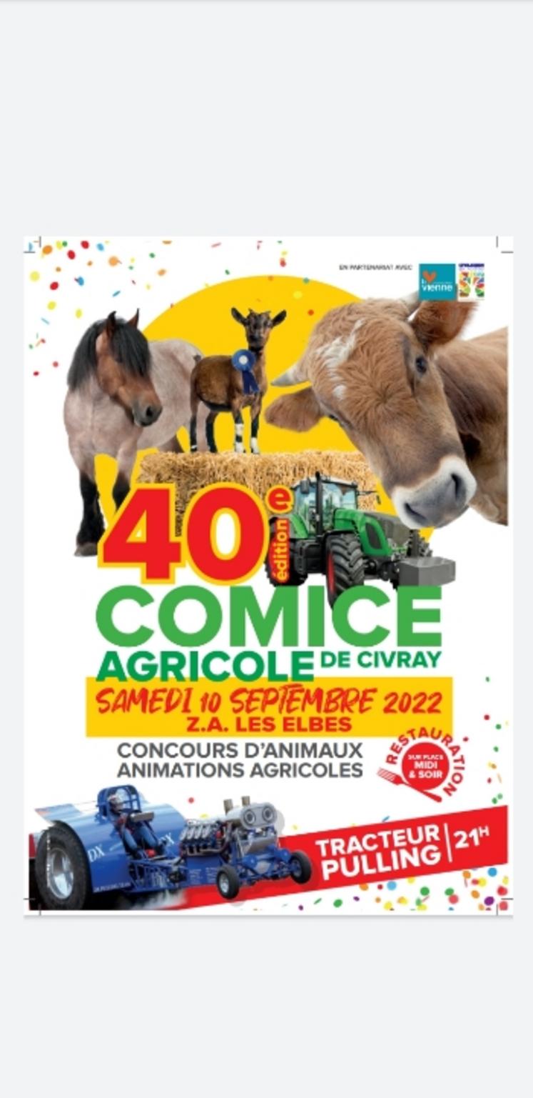 Après une année à Blanzay, pour uen fête commune avec la Fete de la Terre et la Fête des Blés, le Comice fait son retour zone des Elbes à Civray, le 10 septembre. Au programme, comme chaque année, des concours d'animaux, notamment de vaches Limousines et traits mulassiers, mais aussi la présence de chèvres, ainsi que des animations agricoles, et une centaine d'exposants: des organisations professionnelles agricoles et des acteurs économiques du civraisiens. Mais la grande nouveauté de cette année, c'est la présence de 8 tracteurs pulling, qui feront des démonstrations toute la journée, ainsi qu'en soirée. Et pour accompagner tout ça, il sera évidemment possible de se restaurer sur place, midi et soir.