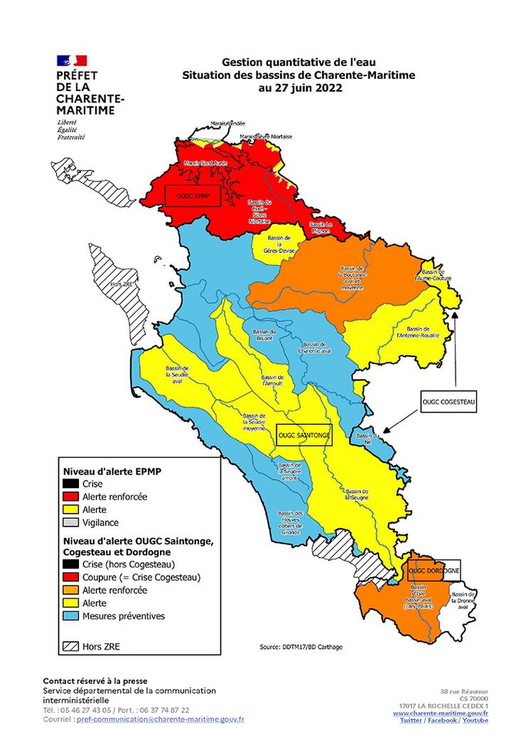 Bassin Fleuves côtiers de Gironde (OUGC Saintonge) : Hors alerte. Mesures préventives : prélèvements à usage d'irrigation autorisés de 19h à 12h. (Arrêté du 14/06/2022)