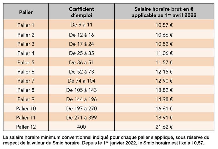Ainsi le salaire horaire est fixé pour chaque coefficient d’emploi en deçà duquel il n’est pas possible de rémunérer un salarié.