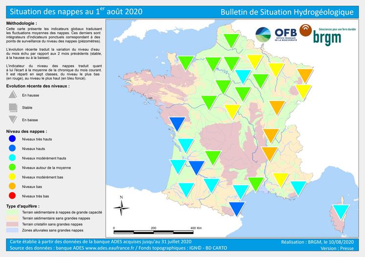 Contrairement aux nappes «inertielles», les nappes réactives sont «très sensibles à l’absence de pluviométrie», car «peu profondes, à circulation rapide et souvent peu étendues», explique le BRGM. Toutefois, après une «très bonne recharge hivernale 2019-2020», la situation globale des nappes françaises est «satisfaisante sur une grande partie du territoire», avec des niveaux «majoritairement au-dessus des moyennes mensuelles». Seules les réserves de l'Est du pays (Alsace, Bourgogne-Franche-Comté et Auvergne-Rhône-Alpes) sont pénalisées par «plusieurs hivers successifs avec des pluies déficitaires que la recharge 2019-2020 n’a pas permis de compenser».