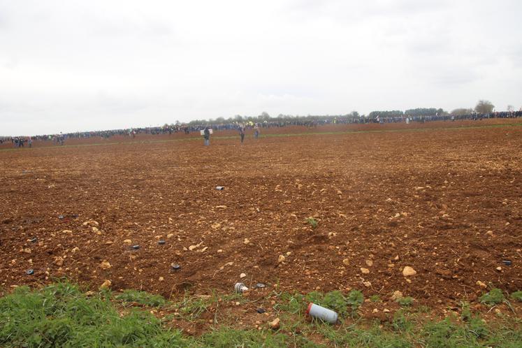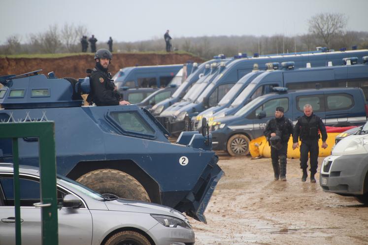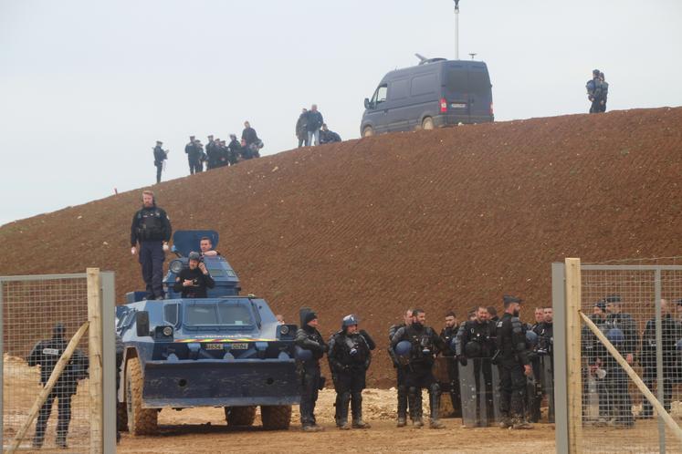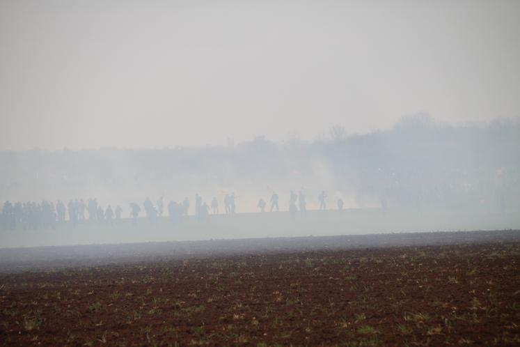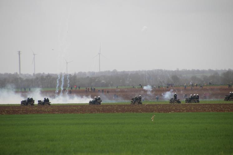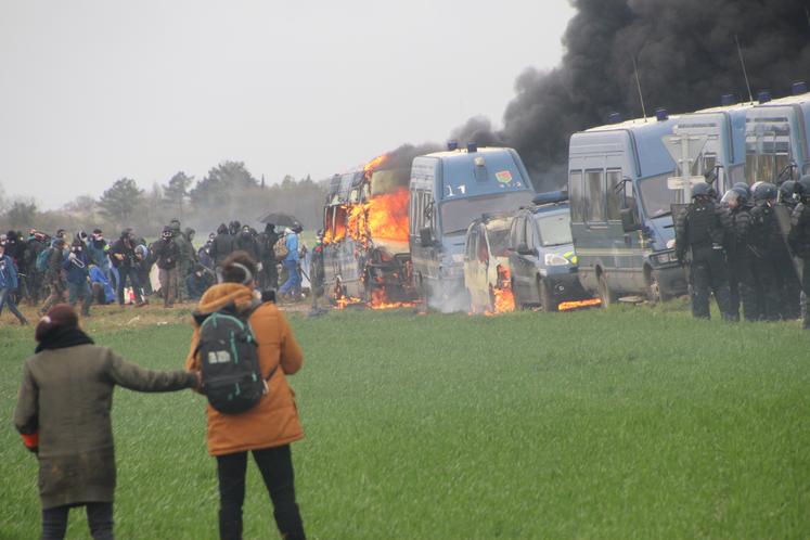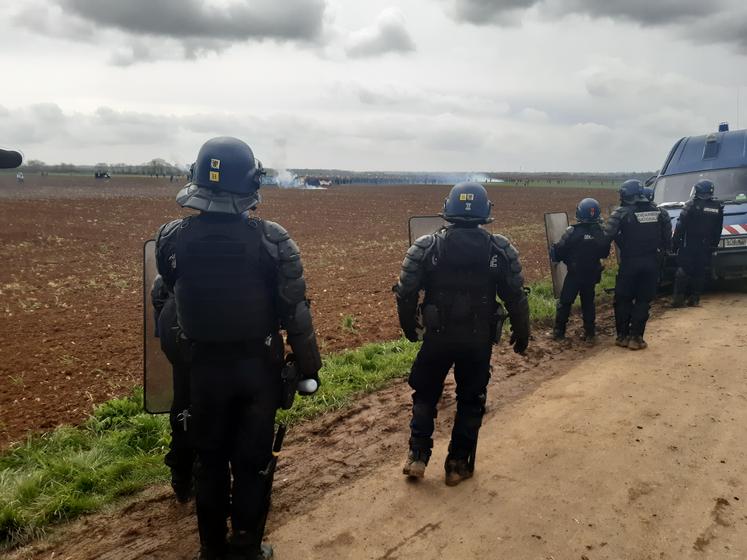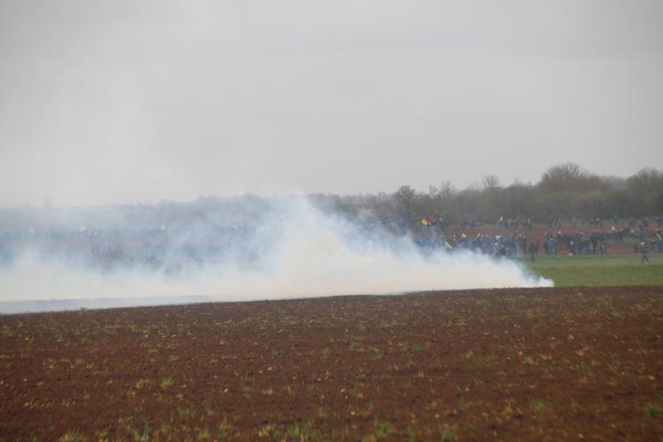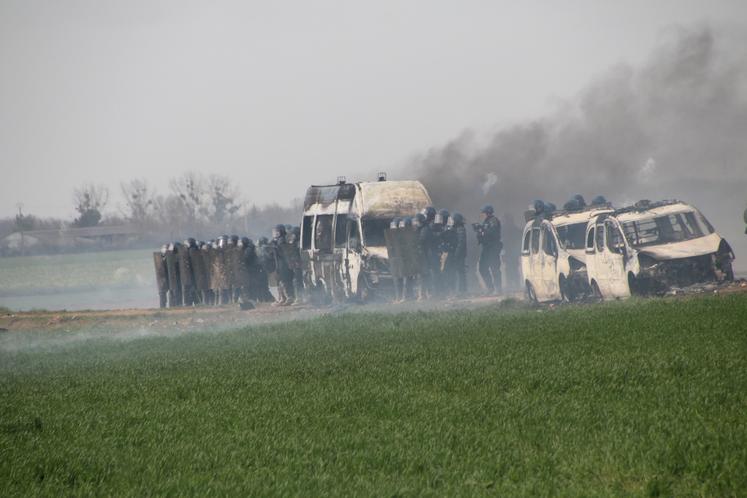 Une formation serrée, avec des personnes équipées de masques à gaz, la tête recouverte, protégées derrière des boucliers et des parapluies, qui a pris pour cible les gendarmes et leurs véhicules, sur le côté nord-est de la réserve. Jets de cocktails molotov, de pierres, de feux d’artifice de sont succédés pendant de longues minutes, aboutissant notamment à l’embrasement de 4 véhicules de gendarmerie. Dans le même temps, les gendarmes ont répliqué avec des grenades lacrymogènes et de désencerclement. Pas moins de 4 000 ont été jetées dans la journée. Un véritable combat, digne de scènes de guerre, qui a duré une heure, et pendant laquelle les «vrais» manifestants sont restés en retrait. Certains ont même quitté le site. Un combat qui a d’ailleurs éclipsé le fond du sujet, puisque le stockage de l’eau n’a finalement pas été réellement évoqué sur place.