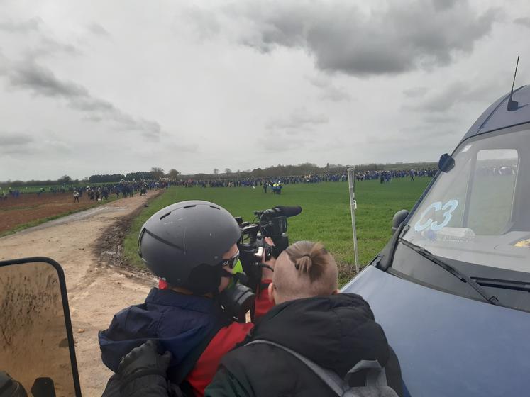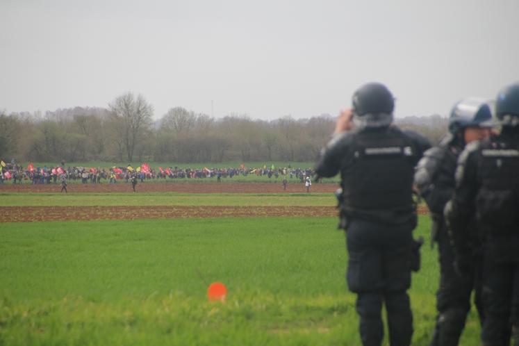 Le lendemain matin, dès 8h, la circulation était à nouveau difficile sur cette route, puisque de nouveaux manifestants rejoignaient Vanzay, pour le départ de la manifestation vers la réserve de Sainte-Soline, prévu à 10h. Au final, autour de 10 000 personnes ont entamé une marche de près de 6km pour rejoindre le site. Dans le même temps, 3200 gendarmes étaient eux répartis sur les routes à proximité (où les véhicules étaient contrôlés, et les accès parfois interdits) et évidemment autour de la réserve de Sainte-Soline. Un dispositif impressionnant avait été déployé tout autour: après les deux clôtures successives, des véhicules de la gendarmerie formaient un cordon, complété par des gendarmes. Ces derniers disposaient également de quads, motos de cross, chars, camion lance eau, et plusieurs équipes de la garde républicaine patrouillaient à cheval. Plusieurs centaines de journalistes étaient présents, dont de nombreuses chaînes de télévision, souvent avec des services de sécurité, comme lors de la plupart des manifestations annoncées comme violentes.