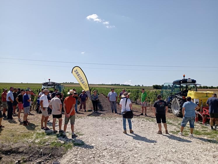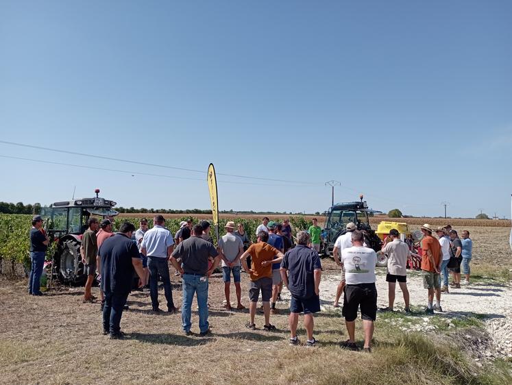 C’est à quelques jours des vendanges, que Nicolas Figeac, conseiller agroéquipement à la fédération des Cuma des Charentes a organisé une après-midi dédiée aux semoirs de couverts végétaux en viticulture, à Saint-Germain-de-Lusignan, sur la parcelle de Julien Guiet, président de la Cuma la Saintongeaise. La Région Nouvelle-Aquitaine et l’agence de l’eau Adour Garonne, ainsi que le Département, étaient aussi partenaires de cet événement. Le secteur se trouve sur le bassin de captage de Coulonge - Saint-Hippolyte. Dans le cadre du programme Re-Sources pour la reconquête de la qualité de l’eau, la sensibilisation à ces techniques-là apporte une pierre à l’édifice. Plusieurs semoirs ont été présenté, sous un soleil de plomb.