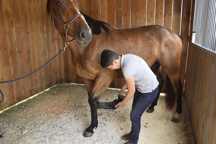Karma débarque du van. Immédiatement, la spécialiste remarque un cheval au « regard un peu triste ». Le robuste selle français de 3 ans fait quelques pas dans la carrière, installée à côté du cabinet d’ostéopathie de Minh-Tâm Franck. Elle constate « des aplombs très dysharmonieux, des articulations qui ne sont pas les unes en face des autres. Un dos rigide et sensible, un abdomen ptosique qui rendent les côtes visibles alors qu’il est en bon état d’entretien ».