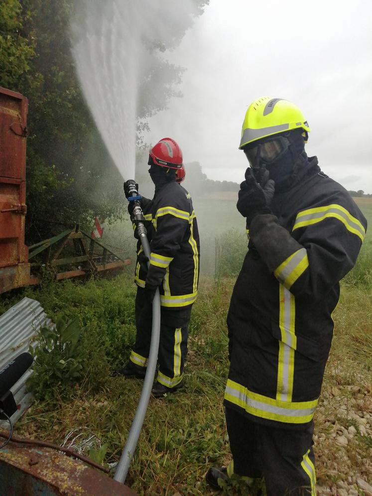 Benoit Vignaud, céréalier à Plaine d’Argenson, court à la rencontre du 4x4 rouge qui entre en trombe dans sa ferme. Le lieutenant des pompiers en descend. En quelques secondes, il s’informe des zones à risque sur l’exploitation : « Où est la cuve à fioul ? Vous stockez des engrais ? ». Quatre véhicules suivent, toutes sirènes hurlantes. Ils se déploient rapidement autour des bâtiments, sur les ordres du gradé.