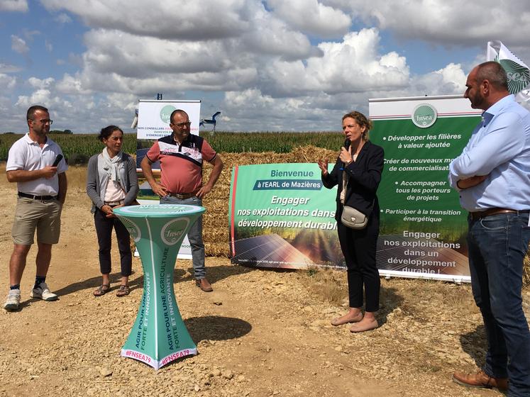 La direction était indiquée depuis le village fleuri de Sainte-Soline pour atteindre le rendez-vous fixé par la Fnsea 79, au matin du 25 juillet : le syndicat avait choisi trois exploitations de la commune du sud des Deux-Sèvres et sa voisine Rom, pour dévoiler sa feuille de route à l’horizon 2030. Jany Bordevaire a ouvert la journée, devant la cohorte d’adhérents, élus locaux et journalistes, pour présenter son exploitation de polyculture-élevage, aux côtés de Denis Mousseau, le président du syndicat.