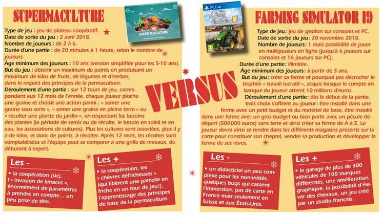 Supermaculture, un jeu de plateau, et Farming Simulator 19, un jeu de simulation sur consoles et PC, s'affrontent au pied du sapin. L'un part à la découverte de la permaculture, l'autre propose de créer et de gérer une exploitation agricole.
