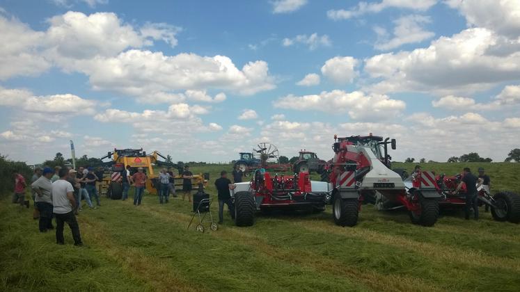 Le but de la démo était d’optimiser le débit de l’ensileuse, en rassemblant trois andains en un seul. Seul l’andaineur à doigts souples, de la marque Agronic, moins large que les autres, n’en a rassembler que deux. D’une manière générale, tous les autres andaineurs ont optimisé le débit.