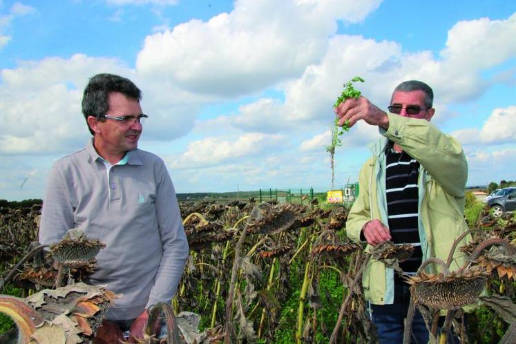 Le principe est simple : semer au printemps de la luzerne porte-graine en même temps que le tournesol. C’est ce que fait chaque année Jean-Paul Thomas sur ses terres Mirebalaises, depuis une quinzaine d’année. En fin d’été, c’est l’heure de la récolte du tournesol. La luzerne implantée entre les rangs du tournesol est ensuite broyée ou récoltée pour servir de fourrage avant l’hiver. C’est donc l’année suivante que la production de semences de luzerne intervient. Puisque la luzerne est implantée dans de bonnes conditions, grâce à cette association avec le tournesol, la production de semences de luzerne devrait être excellente, autant du point de vue qualitatif que quantitatif. « En résumé, avec cet itinéraire technique, on limite considérablement les risques d’une mauvaise implantation et on optimise son coût par une préparation de sol commune à deux cultures » explique Serge Bouet, ingénieur régional pour la FNAMS en Poitou-Charentes. «On sème de façon persque simultanée, mais je préfère faire le tournesol en premier, pour éviter le compactage du sol, qui génerait ensuite le racinage» explique Jean-Paul Thomas.