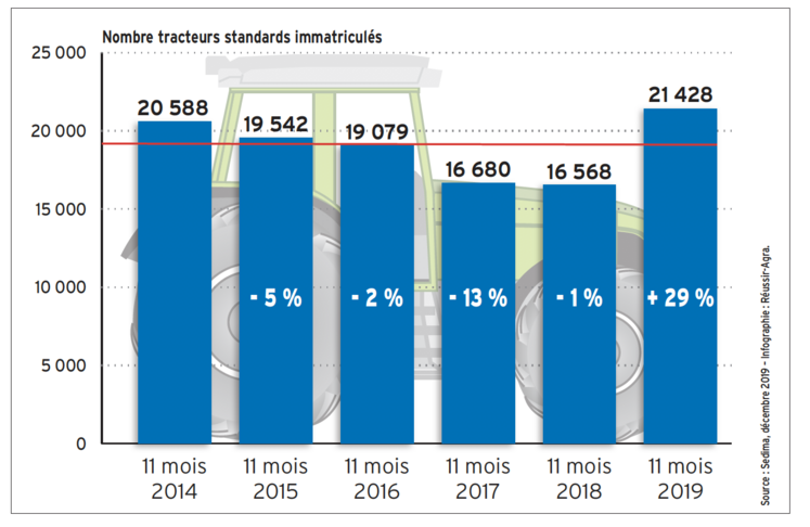 Les immatriculations de machines agricoles sont en forte hausse sur les onze premiers mois de 2019 (+29 % pour les tracteurs standards), mais cette évolution correspond autant au marché qu’à l’agenda réglementaire, a expliqué le Sedima (distributeurs), lors d’une conférence de presse le 18 décembre. La hausse s’explique notamment par la mise en oeuvre du règlement européen 167/2013, aussi baptisé « mother régulation ». « Depuis deux ans, nous avons un effet en décembre qui pousse à l’immatriculation des véhicules, dont certains ne sont pas vendus », a expliqué le président du Sedima, Pierre Prim. Ce n’est pas la première fois que les immatriculations sont ainsi perturbées. Elles avaient été grandement accélérées au premier semestre 2017 par la fin du dispositif de sur-amortissement dit Macron. En réalité, le marché est bien dynamique en 2019, mais de manière moins prononcée.