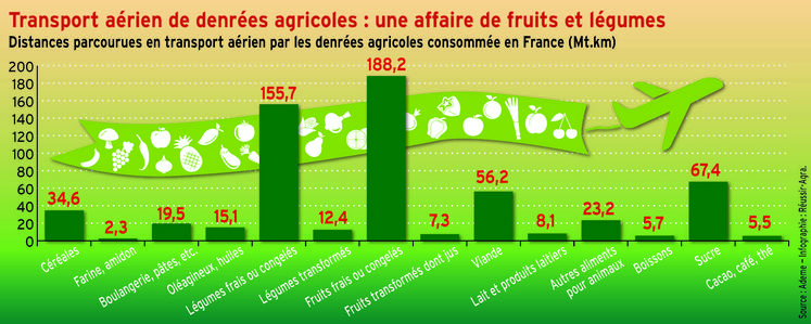 Le transport aérien représente 0,5 % des distances parcourues par le transport des produits alimentaires consommés par les Français (soit 850 Mt.km, sur 201 Mrdt.km), mais 5 % des émissions de CO2 induites (soit 1,1Mt CO2, sur 18,4 Mt CO2), selon un récent rapport de l’Ademe.