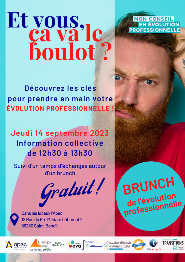 Le 14 septembre un brunch gratuit est proposé par les acteurs du conseil en évolution professionnelle et transitions po Nouvelle-Aquitaine, pour prendre en main son évolution professionnelle et discuter. L’évènement se déroulera dans les locaux de l’APEC ( 12 rue du Pré Médard - Bâtiment 2, 86 280 Saint-Benoit), et en présence des experts de l’emploi à Poitiers : l’APEC, CHEOPS Nouvelle-Aquitaine, les Missions Locales, Pôle Emploi, le Réseau EVA et Transitions Pro.