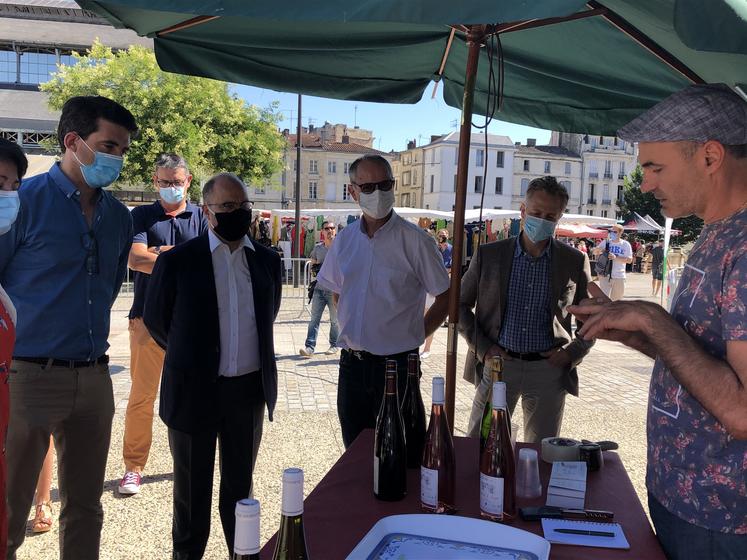À l’occasion du lancement de la saison 2020 des Marchés des producteurs de pays, la chambre d’agriculture, en partenariat avec la ville de Niort, organisait le premier marché des vins et bières sur la place du Donjon à Niort le 18 juillet. Une dizaine de producteurs et artisans étaient présents pour faire découvrir leurs produits. Les fidèles du marché de Niort ont pu apprécier une gamme de produits très diversifiés du département tels que jus de raisin, vin rosé (cabernet d’Anjou ou rosé de Loire), vins blancs secs ou moelleux, vins rouges, fines bulles, Saumur brut, Pineau – Cognac, bières artisanales, et même des tisanes en dégustation. Cette première édition pourrait être le début d’une série.