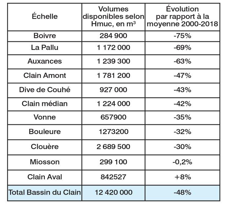 Cela fait bientôt 3 ans qu’on en entend parler. L’étude Hmuc (Hydrologie, milieux, usages, climat), réalisée par l’EPTB est enfin terminée, et on connaît donc ses conclusions sur l’état réel des masses d’eau. «Dans la Vienne, cela fait 30 ans qu’on a des déséquilibres» rappelle le Préfet, Jean-Marie Girier. «L’intérêt de cette étude, c’est de connaître les volumes prélevables pour les différents usages, tout en préservant le bon état des eaux». Comme on s’en doutait, l’étude préconise une diminution drastique des volumes prélevables*, surtout en période estivale:4,20 Mm3, soit 73% de moins que la moyenne entre 200 et 2018. Sur la totalité d’une saison, c’est 12,42 Mm3 de prélèvements qui est préconisé. Des baisses très différentes selon les 12 unités de gestion du bassin du Clain. Sur la Pallu, par exemple, il est préconisé des baisses de 23% au printemps, de 90% en été et de 100% l’automne.