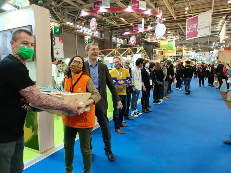 L’association Solidarité des producteurs agricoles et des filières alimentaires (Solaal) a organisé le 3 mars une immense chaîne de dons alimentaires dans le Hall 4 du Salon de l’agriculture, autour notamment de la présidente de la FNSEA, Christiane Lambert, du président JA, Samuel Vandaele, du président des Chambres d’agriculture, Sébastien Windsor et de celui de de la Coopération agricole, Dominique Chargé.