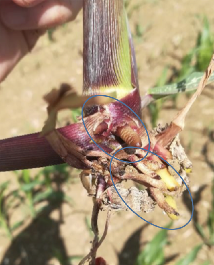 On retrouve la présence de racines nécrosées, notamment les premières racines coronaires, qui n’ont dans ce cas pas joué leur rôle. Ces symptômes sont clairs et nets dans les observations d’Arvalis mais le sont un peu moins dans certaines parcelles.