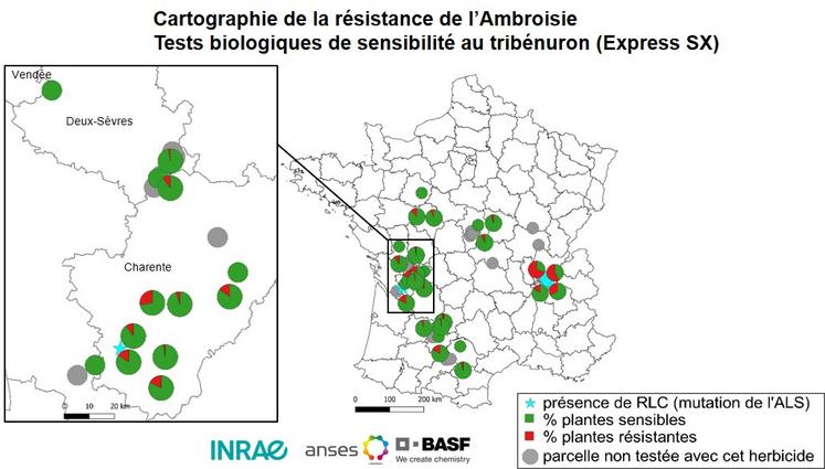 Les derniers tests réalisés font apparaitre les premiers foyers de résistances de l’ambroisie aux herbicides de la famille des ALS (HRAC B). En Poitou-Charentes, les premières résistances identifiées sont celles au tribénuron et à l’imazamox.