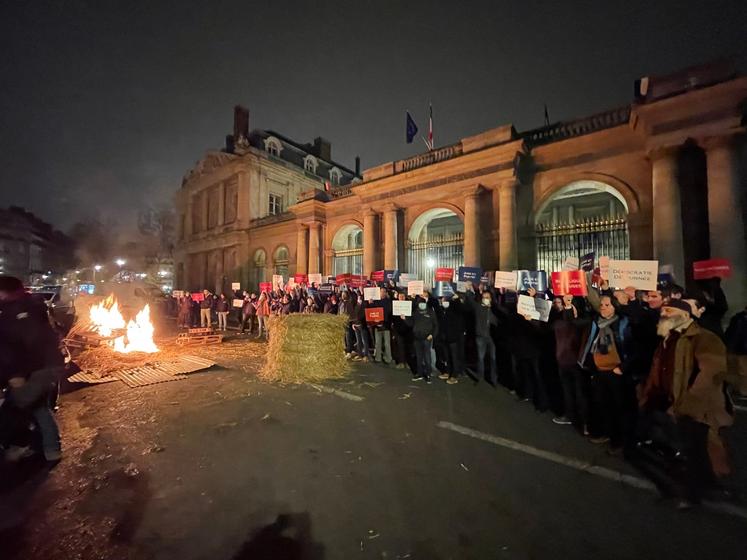 Entre 200 et 300 agriculteurs s'étaient regroupés devant l'institution, avant d'allumer un feu et d'accrocher aux grilles du bâtiment public une bâche arborant le slogan «Conseil des juges - République des juges».