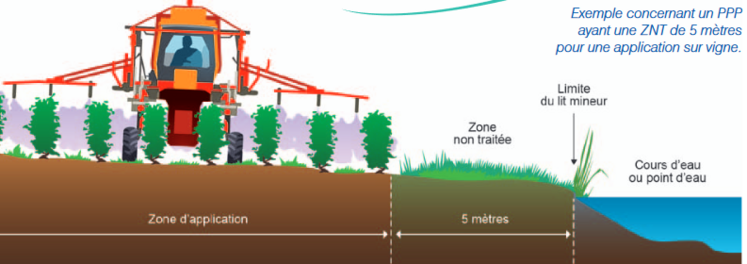 Pour connaître la distance de sécurité, il faut, premièrement, bien regarder le produit et surtout l’étiquette de celui-ci. Si elle mentionne une « ZNT cours d’eau », c’est cette distance qui s’applique. Celle-ci peut varier : 5m, 20m, 50m ou une largeur supérieure ou égale à 100m. Cependant, les ZNT de 20m ou de 50m peuvent être réduites sous trois conditions : présence d’un dispositif végétalisé permanent d’au moins 5m de large en bordure de point d’eau (arbustif ou herbacé) selon la culture ; utilisation de dispositif performant et homologué antidérive et tenue d’un registre phytosanitaire à jour.